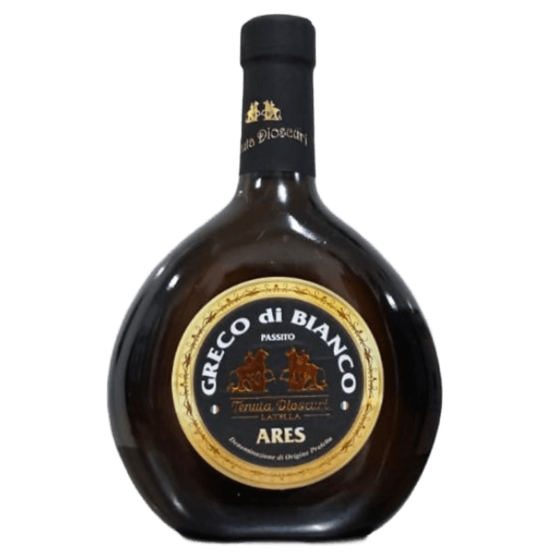 Vino Greco Di Bianco DOP passito Ares. Vinificazione in bianco in serbatoi d’acciaio a temperatura controllata. Maturazione in Barriques di rovere francese dove il vino permane per circa 2 anni. Affinamento in bottiglia per 6 mesi. Ha un colore giallo dorato con riflessi ambrati. Cristallino e Consistente. Al naso Fruttato è Floreale complesso con sentori di datteri e miele, noci e pepe nero, mandorle e albicocca, senape e fichi caramellati.